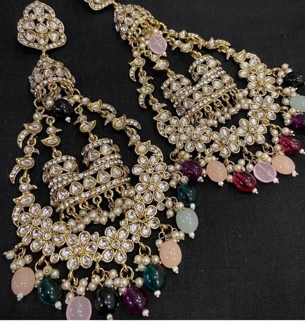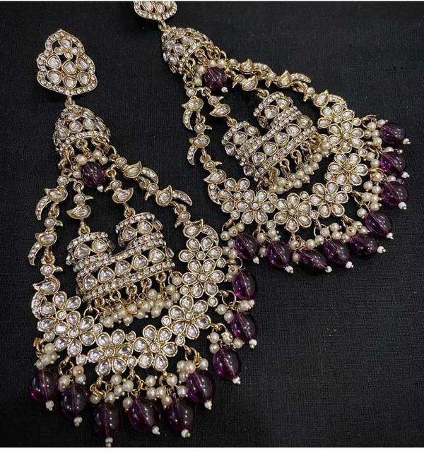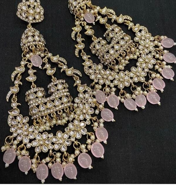 Pink and white geometric drop big size earrings, gold-plated, adorned with delicate artificial beads, secured with a sleek post and back closure